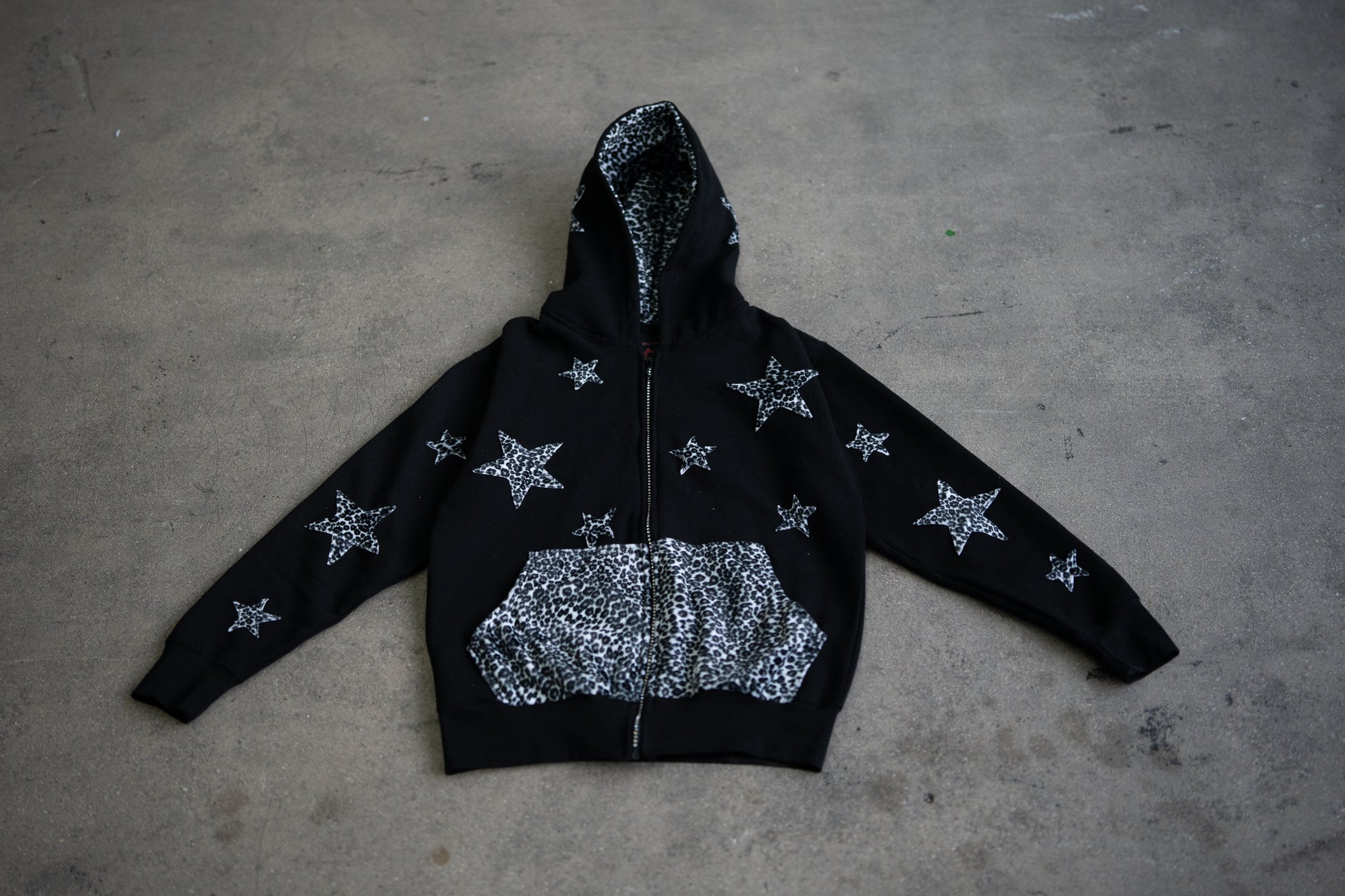 The zip-up hoodie comes loaded with cut-and-sewn leopard print stars wrapped all around, bringing bold texture and streetwear flavor from every angle. The rhinestone zipper adds the perfect shine — a light-catching detail that makes the whole piece pop.