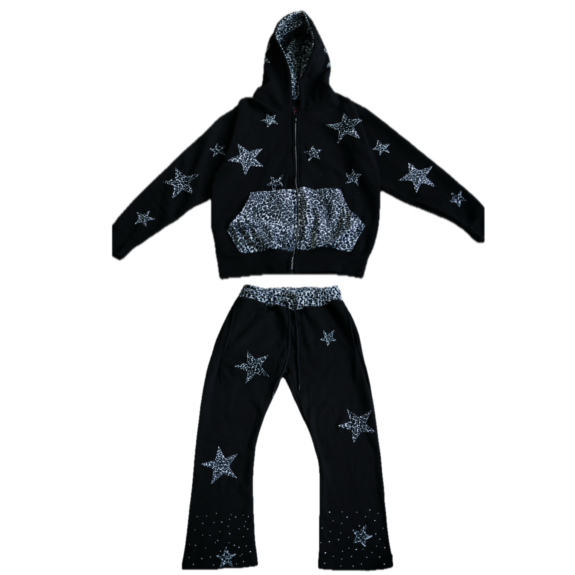 The stacked sweats complete the set with rhinestones lined across the bottoms and leopard print stars sewn throughout, giving you a head-to-toe statement look that hits every time you step out.